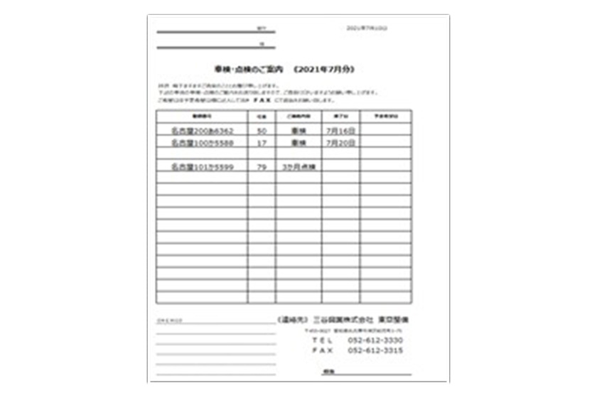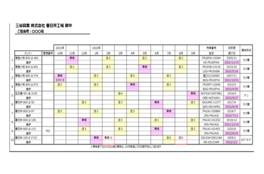 - 全車両の車検・定期点検スケジュールを月単位で一元管理
