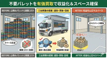 廃棄物の有価物化・リサイクル廃プラスチックパレットを買取回収し、リサイクル資源として有価物化